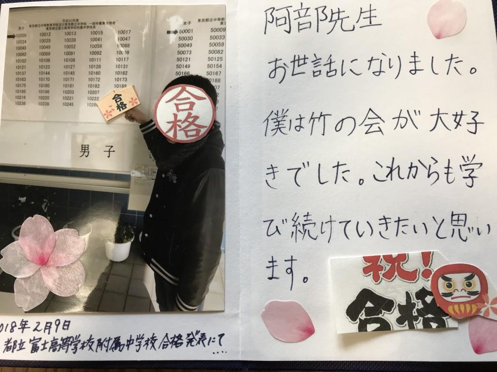 合格できたのは、これ以外にも過去問を何度もやり返すことで適性問題に慣れたり、土日の勉強をがんばることや、ぼくにとって大きな存在であった4年生から竹の会に通っていた男の子(注釈:本年小石川合格者)に影響を受けたことなどいろいろありました。